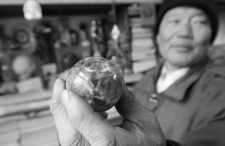 在郭國(guó)謙收藏室中任意掂出一件東西,都有一段故事。在收藏室一角的架子上,一枚直徑約有25厘米的綠色圓球引人關(guān)注,郭國(guó)謙將其拿至暗處,只見圓球發(fā)出熒熒微光。“這就是人們常說的夜明珠。”郭國(guó)謙說。