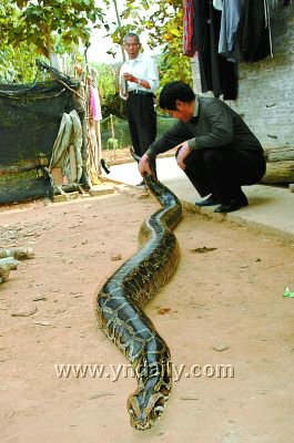 有時候夜間天冷時,蟒蛇還會爬出房間,將楊建松臥室的門弄開,爬上床來與楊建松同床共枕,碰到楊建松睡覺翻身壓到身上時,這條蟒蛇還會“自覺”地挪挪身子給他騰地方。這樣的狀況一直持續到楊建松結婚,將其安置在后院特制的鐵柜中才告結束。