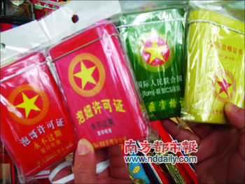 24日下午,記者在黃埔軍校舊址紀念館大聯(lián)盟商店的一攤紀念品中,赫然發(fā)現(xiàn)一只紅彤彤的“泡妞許可證”,拿起來方知是只鐵皮煙盒。除此之外,還有以國徽為背景的“中華人民共和國超級帥哥證明”、“泡哥許可證”、“靚女證書”、“土匪資格證”、“流氓合格證”、“光棍證”、“傻B證”等五花八門的煙盒。