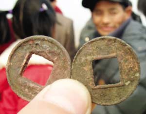 昨天上午,許多住在西石橋村周圍的村民聽說此事后,紛紛趕來尋寶。記者在現(xiàn)場看到,幾十名當?shù)卮迕衲弥ぞ咴谕炼牙飦y挖,還有的村民將剛剛挖出來的古錢幣拿給記者看。一名姓王的大爺拿著幾枚挖出來的錢幣告訴記者,過去在這座古墓周圍,曾出現(xiàn)過許多這樣的古錢幣,聽老一輩講,很久以前這里就是一片墳地,盡管也有村民種地時經(jīng)常發(fā)現(xiàn)古錢幣,但從來沒有人敢到這里亂挖的。記者現(xiàn)場看到,聞訊趕來挖寶的村民越來越多,一上午先后有上百人光顧。村民挖出的這些古錢幣上有不規(guī)則的花紋。