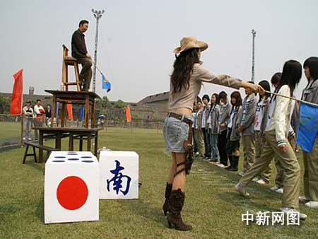 參賽者通過紅旗指揮著每個美女麻將牌,被點到打出去的麻將牌,充當麻裝牌的美女就把風衣脫掉,露出里面的麻將牌。然后用舞蹈、體操、武術的動作跳到草地中間去,轉上一圈。