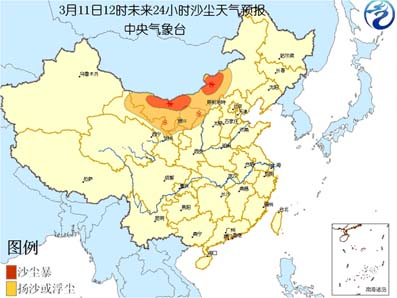 中新網3月11日電 中央氣象臺今天上午十時繼續發布沙塵天氣預報:受東移冷空氣影響,預計今天中午到明天中午,甘肅河西走廊、內蒙古中西部、寧夏北部、陜西北部等地有揚沙或浮塵天氣,內蒙古中西部偏北的部分地區有能見度小于1000米的沙塵暴。