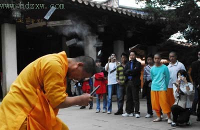 事件實(shí)錄:“哇,鐵條斷了、三根都斷了!”,在泉州南少林寺大殿廣場(chǎng)前,圍成一圈的觀眾群中響起了一陣陣驚嘆聲。幾分鐘前,在眾多媒體及游客面前,泉州南少林寺弟子釋振明在短暫的凝神運(yùn)氣后,用頭撞向鐵板。一撞之下,三條規(guī)則疊放在一起、半米長(zhǎng)、總厚度達(dá)1.5厘米的鐵條瞬間碎成了四五截、飛出四五米開(kāi)外。在這一手高超的“鐵頭功”面前,幾位小朋友驚奇得連嘴都沒(méi)合上。