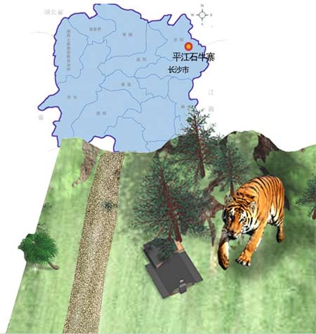 2006年10月30日,平江縣虹橋鎮(zhèn)洞口村七星巖電站閃石巖驚現(xiàn)虎蹤。據(jù)目擊者魏強根說,該動物體長約1.3米以上,渾身是條形斑紋,在地上留下的足印有10多公分寬。
