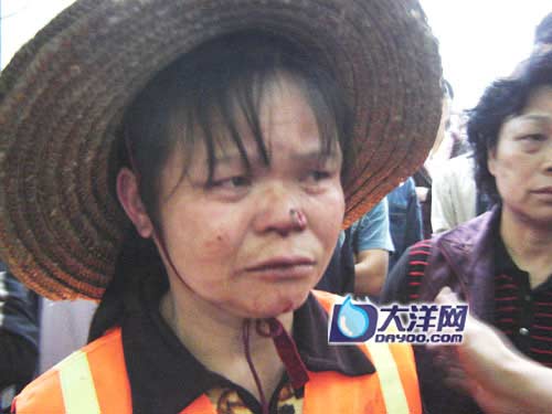 緊接著,目擊者看到,挨打的環衛女工突然將清潔車推向警車,并停在警車前擋住那名司機的去路。“接下來的那一幕令我們很痛心。那司機見環衛女工擋住他的去路,竟然又下車,并一手抓起放在路邊的清潔鏟,猛地向環衛女工頭部掄了一鏟。”女工的臉當場被打得流血,頓時,氣憤的市民紛紛報了警。