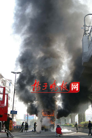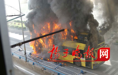 昨天上午7時55分,一輛雙層100路公交車在南京市雨花西路高架橋沿線尾部發生自燃,濃煙升騰數十米。時值上班高峰,公交車內有乘客60多位。一騎車上班的市民發現火情后,奮追100多米,向駕駛員通報火情,隨即司機停車并及時疏導乘客,后因火勢太大,公交車瞬間成了“火”車,還危及地鐵中華門站10多米高正在運行的地鐵線。隨即,消防官兵趕到現場,撲救大火。整個過程中,沒有乘客受傷。但是大火將公交車燒成了一個空殼,烤化了附近的店家門面招牌,熏黑了地鐵柵欄,道路旁的植物也被烤死。