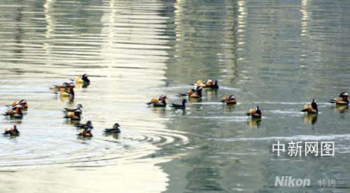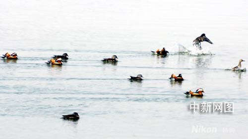 成群鴛鴦飛臨吉林延吉布爾哈通河(圖)