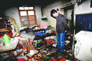 昨日7時(shí)許,記者在事發(fā)現(xiàn)場(chǎng)看到,發(fā)生汽油爆燃的平房分為兩間,墻壁和桌面上到處是焦黑的熏痕。平房孤零零立在一片拆遷廢墟之上,周圍只零星散布著其他幾棟平房。