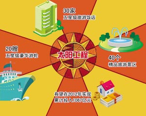 “太陽”工程主要包括建20艘五星級豪華游輪,30家五星級旅游飯店以及40個精品旅游景區等內容。工程有望在2012年實現,累計投入1067億元。