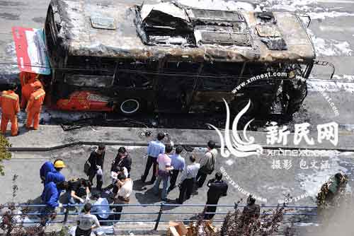 事發現場永樂電器的一位工作人員則告訴新民網記者,等該目擊者從店內出來時,看到有3名乘客被從燒毀的公交車抬出。(記者 楊揚)