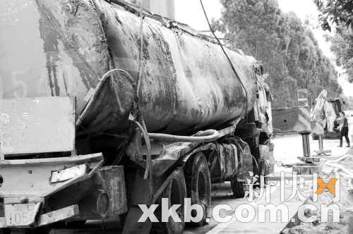 現場一救援人員告訴記者,經消防員現場勘察后,現場指揮員決定先稀釋泄漏硫酸,然后設法將裂口堵住,“我們初步估計當時已有6噸左右的硫酸發生泄漏。”隨后,消防員用一支開花水槍對泄漏出的硫酸進行驅散稀釋,“后來我們砍倒路邊一棵小樹,把它削尖后再堵在泄漏的地方,這樣才把漏洞堵住”。