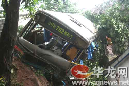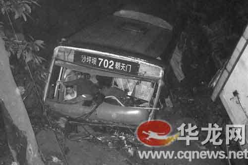 今晨5:18,一輛從朝天門開往沙坪壩的702路公交車(車牌渝A25732)行駛至嘉陵江大橋北橋頭時,駛出橋面,墜下約10余米深的橋下堡坎。造成4人輕傷,10人重傷。目前,傷員已送往急救中心搶救。