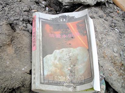 在青川縣濱河街一居民樓瓦礫中,有一本上面布滿灰塵的書——《情愛永恒錄》。的確,在廢墟上的情愛是永恒的、是香甜的。