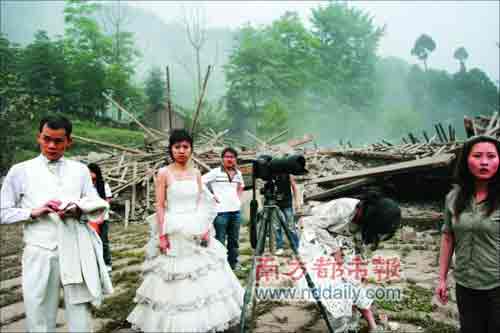 昨天,拍照的攝影師和照片中的新娘接受了本報(bào)記者的電話(huà)采訪(fǎng)。新娘的家人都在震中的汶川縣臥龍鎮(zhèn),至今沒(méi)有任何消息。