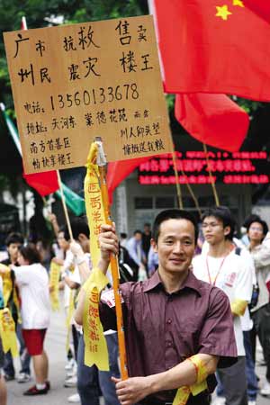 昨日,有一個(gè)人,隨著號(hào)召募捐行動(dòng)的志愿者隊(duì)伍,從正佳廣場(chǎng)西北門(mén)的活動(dòng)現(xiàn)場(chǎng)一直跟到另一主會(huì)場(chǎng)僑鑫教育大院。他始終默默站著,沒(méi)和任何人說(shuō)話;而他手上,則舉著一塊自己制作的簡(jiǎn)陋牌子,上面寫(xiě)著“廣州市民抗震救災(zāi)售賣樓王”,引來(lái)好多路人觀望。