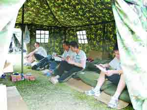 四川省北川中學,這塊明顯有些泛舊的校牌,此時端正地懸掛在位于綿陽市長虹培訓中心一座二層小樓的外墻上。培訓中心的大門被拳頭粗的鐵鎖牢牢關緊,只有當教職員工或記者進出時,才會擠出一條狹窄的縫隙。走進其中,人們可以看到一座座整齊排列的綠色迷彩帳篷,不時會有孩子們擦身而過。他們的臉上沒有憂傷,盡管他們才剛從夢魘中驚醒。
