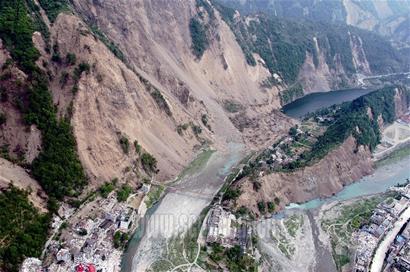 昨日上午9時,記者登上運送搶險物資的直升機,飛機穿過北川縣城南端的險要溝壑后,緩緩飛入四處塌方、滑坡的唐家山山谷。透過飛機的舷窗,遠遠地可以看見前下方狹長河堤上有一個巨型堤壩,堤壩上面的凸出部位依稀可見隨風飄揚的紅旗。“這是搶險部隊插的,你看上面都有他們的部隊名稱呢。”隨機護送物資的戰(zhàn)士解釋說。
