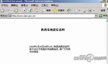5月29日22點左右,記者登陸陜西地震局網站,已經無法看到正常的地震信息網頁面。頁面上只有兩行簡單文字,“2008年5月29日20時53分,陜西地震信息網被不法分子發布地震謠言,請廣大市民切勿相信。”