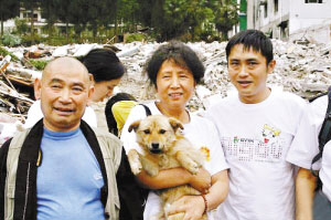 汶川大地震中,有兩只狗狗感動了全中國人。近日,這兩只在彭州銀廠溝一直舔著被困的王友瓊老人的嘴唇,使其在被困196個小時仍得以生還的“義犬”——“前進”和“乖乖”,被“愛之家”小動物保護中心在彭州當地找到,并被運回成都。至此,此前網上盛傳的這兩只“義犬”被殺、被吃的傳聞被打破。
