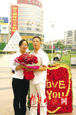 記者昨天下午趕到現(xiàn)場看到,“巨無霸”條幅掛在金龍大廈的東側(cè),由于地處鬧市區(qū),吸引了很多市民駐足圍觀。市民尹先生是“萬里路”的朋友,參與了“萬里路”特別求婚的整個“策劃”過程。他告訴記者,當天中午1時,被男友“萬里路”約到廣場的“淑女貓”,無意中看到“求愛”條幅后先是一怔,剛轉(zhuǎn)過身來,男友就像變魔術(shù)一樣捧出了大把玫瑰花,并向她單膝下跪求婚,毫無思想準備的女孩頓時激動得流下了眼淚。還沉浸在幸福當中的“淑女貓”接受記者采訪時說,她和男友是通過網(wǎng)絡認識的,“萬里路”“淑女貓”都是他們的網(wǎng)名,幾天前男友曾對她表示有件很重要的事情要和她說,當時她沒有過多在意。當天中午見到巨型條幅和999朵玫瑰花后,她感覺整個人都“蒙”了,幸福得“不知所措”、“也不知道說什么好”。