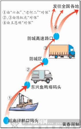 為進(jìn)一步降低風(fēng)險,陳虹光也如法炮制,將從越南碼頭到防城倉庫一段,“對保”給東興人“六叔”、“老何二”(另案處理)。