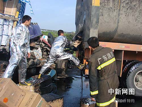 京珠高速公路廣東段槽罐車被碰撞瀝青泄漏(圖)