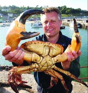 英國白金漢郡愛斯勃雷市潛水員保羅·沃斯利在多塞特海岸的利米灣潛水時,竟然在48米深處的一艘戰艦殘骸下發現了一只重達7.7公斤、寬達30厘米的“妖怪螃蟹”!沃斯利冒著危險將這只“超級螃蟹”捉上了水面,專家相信,這只螃蟹是全世界曾經捕上岸來的最大可食用螃蟹。