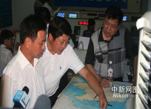 臺州市委副書記朱賢良(左)、臺州市副市長、臺州市海上搜救中心主任葉阿東、臺州海事局局長、臺州市搜救中心常務副主任陳興柱左搜救中心指揮海上搜救。 作 者:占茂鴻