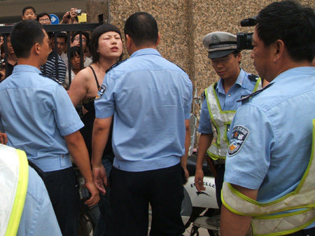 襲警女子態度囂張 被打警察(右一)的背心已被扯下 (孟繁勇/圖)