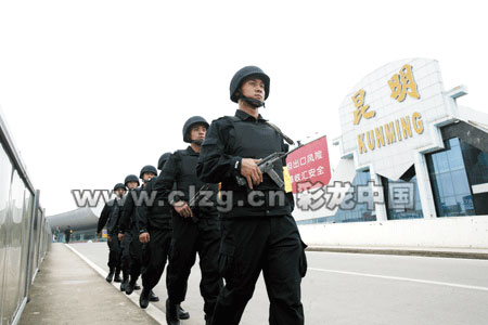 幾名頭戴防彈頭盔、身穿防刺背心、手握微型沖鋒槍全副武裝的民警,威風凜凜地從人群中走過,和其他民警不一樣的是,他們手臂上戴著寫有“昆明特警”醒目字樣的袖章。按省公安廳和市公安局的要求,從前天下午3點開始,昆明市公安局特種警察支隊進駐昆明機場、火車站及各大汽車客運站,開始不間斷的武裝巡邏。