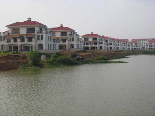 7月28日下午,記者在“政和花園”小區看到了一個30多畝的人工湖,湖畔綠樹婆娑。環湖而立的是一座座紅頂黃墻的別墅,每幢別墅三層。別墅之間互相獨立,依次排列。