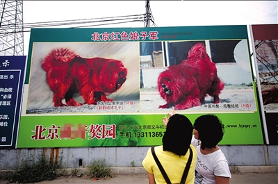這幅廣告長約兩米,“北京紅色娘子軍”的字樣下,是兩張藏獒照片,毛色粽紅油亮。據了解,這是順義一家獒園的廣告。“廣告講噱頭,但也不能將藏獒比成紅色娘子軍啊。”附近居民高女士說,這樣的廣告方式過了頭,看了心里特別不舒服。