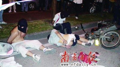 當晚,記者趕到現場看到,其中一名搶匪側躺在地上,屁股部位稍稍露出,醫院護士已對他的傷口進行了包扎。醫生表示,已為搶匪做了臨時包扎,目前其沒有生命危險。另外兩名搶匪則坐在地上,現場還有一輛翻倒的摩托車和一個女式手提袋。