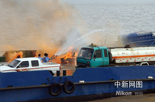 在演習模擬現場,“海太七號” 在正常航行途中,甲板水手長突然發現一車上人員提著一只裝有燃料油的塑料桶下車,飛快走向一輛裝有甲醇危險品的車輛,將手中的汽油灑向甲醇車,掏出打火機、點燃大火。他跳上裝有甲醇的槽罐車開啟閥門,讓甲醇泄漏,企圖制造更大的恐怖事件。渡船船員迅速與恐怖分子展開搏斗,組織滅火,并將險情向海門市政府和南通海事局交管中心報告。