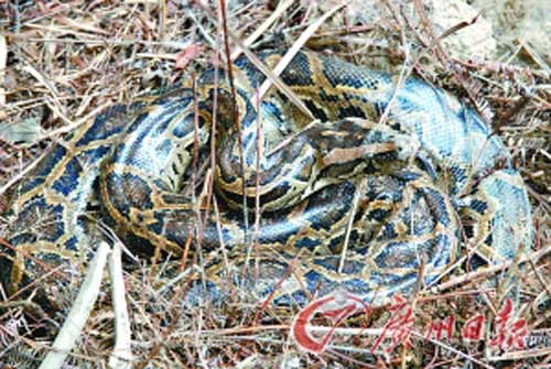 甘濟源說,當他走到屋后放在屋檐下的一堆雜草中翻尋時,竟發(fā)現草叢中還藏著另一條灰黑間黃的大蟒蛇,蛇腹下還堆著一團20多個直徑20多厘米的橢圓形蛇卵。