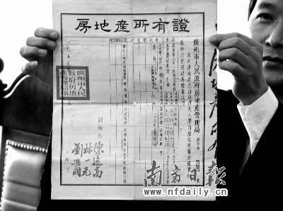 原告代理律師向記者出示吳老太留下的這份房產證。洪奕宜攝