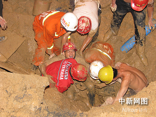 17時06分,一輛大型鉤機到達現場,將深坑下的大塊水泥板鉤出,為救援取得空間。18時35分,現場救援人員發現被困男子出現瞌睡現象,醫護人員立即取來葡萄糖,由于救援空間限制無法給男子打點滴,醫護人員只好讓男子喝下葡萄糖,并為男子接上氧氣,且讓一名工友陪同講話,防止男子昏睡。19時10分,經過現場救援人員的努力,一直壓在男子身上的斗車被吊離,男子右腿被成功救出。但是由于男子是半跪姿勢,背部大石塊妨礙了左腿救援,無法將左腿拿出,消防隊員和其他工人只好采取手刨的方式,一點一點將男子左腿膝蓋前泥土挖出。經過3個多小時的營救,19時50分,男子被成功救出,經醫生初步診斷,男子雙腿無大礙。
