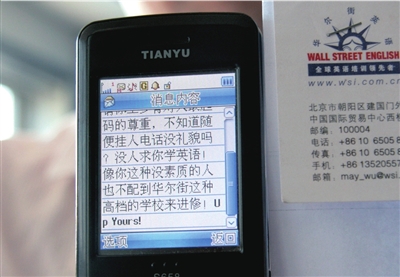 昨天,市民劉先生反映,他因掛斷華爾街英語國貿中心課程顧問的電話,對方于8月9日中午給他發來辱罵短信,有罵其沒有素質、不配到高檔學校進修等內容。經交涉,華爾街英語方面向其致歉,并對員工作出警告處理。