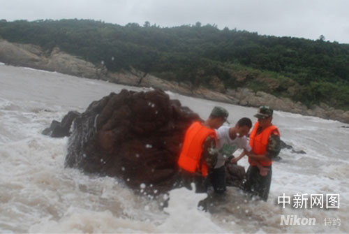 圖為洞頭邊防戰士們從礁石上將癡心少年救出。賀應欽 攝影