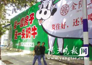 “買房送奶牛,還有這樣的事情?”昨天一大早,記者接到一個朋友的電話說,他在新街口看到一幅“金陵王榭”樓盤的戶外廣告,廣告詞寫著“買一套房子送一頭奶!。朋友感到很納悶,都是市中心的房子,奶牛送回家怎么養(yǎng)呀?根據(jù)朋友的介紹,記者來到了這塊頗為“醒目”的廣告招牌底下,只見廣告牌上買房子送奶牛的大字頗為醒目。