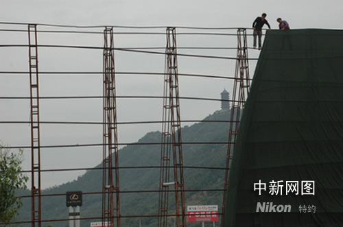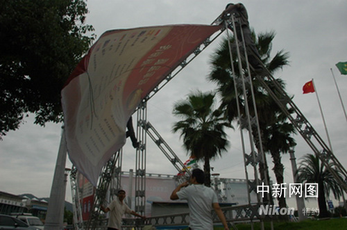 工人在浙江臺州一國慶車展現(xiàn)場加固施工,以應(yīng)對超強臺風“薔薇”的到來。作者:陳林聰