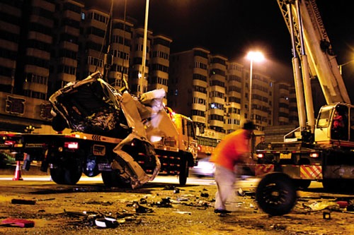 嚴重損毀的面包車被吊離現場 記者 林桂炎 實習生 吳魯 攝