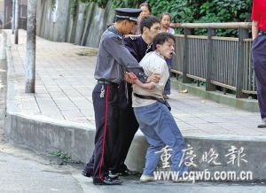 昨天清晨,一男子潛入南岸區南坪麗華酒店5樓洗腳城盜得一部手機后,被酒店保安江海濤追上。小偷掏出幾張百元大鈔哀求江海濤放行,被拒后翻臉抽出刀子威脅。江海濤徒手與毛賊展開搏斗,在趕來的同事的幫助下,將毛賊制服并扭送派出所(如圖)。