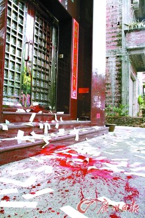 昨日(10)凌晨,佛山市順德區(qū)新隆村村主任陳某的宅所遭襲。陳宅的大門被人用鐵鏈反鎖,并澆滿紅油漆,肇事者臨走前,還在門口點起了白蠟燭,撒下了大量冥幣和紙錢。