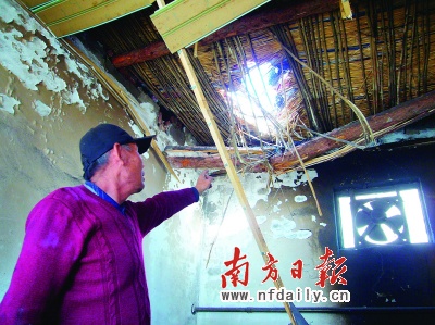 丁學聰老漢指著被砸穿的屋頂,仍然心有余悸。