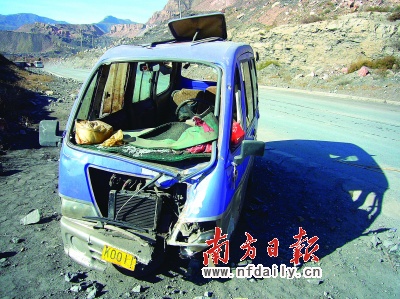 三輪摩托車被砸得面目全非。