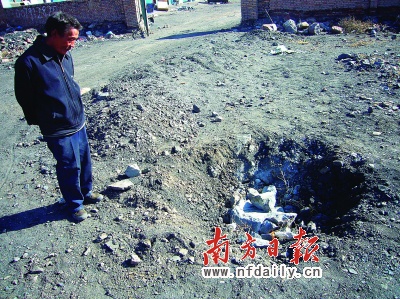 在距離爆破現場數百米的地方,飛石砸出了一個大坑。