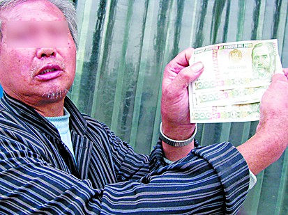 17日,記者在振華路見到了被騙走6000元的譚老先生。他告訴記者,17日下午1時左右,他在滄口廣場附近收廢品,突然有兩個20多歲的年輕人與他搭訕。這兩個年輕人自稱來自福建,與老板三個人一起來青島出差。到青島后,他們的車出了車禍,老板已經被送到了醫院,急需交住院費,但是無奈身上只帶了一些外匯,來不及去銀行兌換,所以想跟譚先生兌換6000元錢。其中一個年輕人拿出5張外匯,每張外匯上標有“1000”的字樣,并告訴譚先生,這5張1000元的英鎊值1萬多元人民幣。譚先生覺得很劃算,于是從家里拿了6000元錢與對方兌換。
