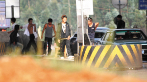 16日下午2點,記者來到丫普龍收費站。通過的車輛很少,6個收費道口只開放4個。紅白相間的收費亭里,坐著幾名身著工作服的收費員。每個收費匝道口都橫著一根涂有反光涂料的欄桿,幾個身著各式T恤、襯衫的年輕小伙坐在匝道旁。他們身旁擺放著幾根木棍,大約1米長,其中一人的坐椅下還擺放著一根鋼管。