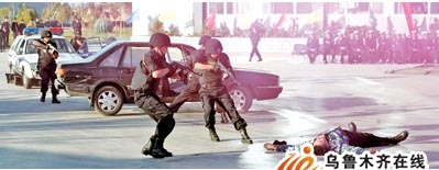 高速公路上,一輛黑色轎車突然沖過交警卡點(diǎn),警笛響起,頭戴鋼盔、手持微型沖鋒槍的特勤民警快速出擊,嫌疑人向民警開槍時(shí)被“擊斃”……10月21日,新疆高等級公路交警支隊(duì)進(jìn)行了建隊(duì)十年來,規(guī)模最大的一次快速應(yīng)對高速路突發(fā)事件演習(xí)。